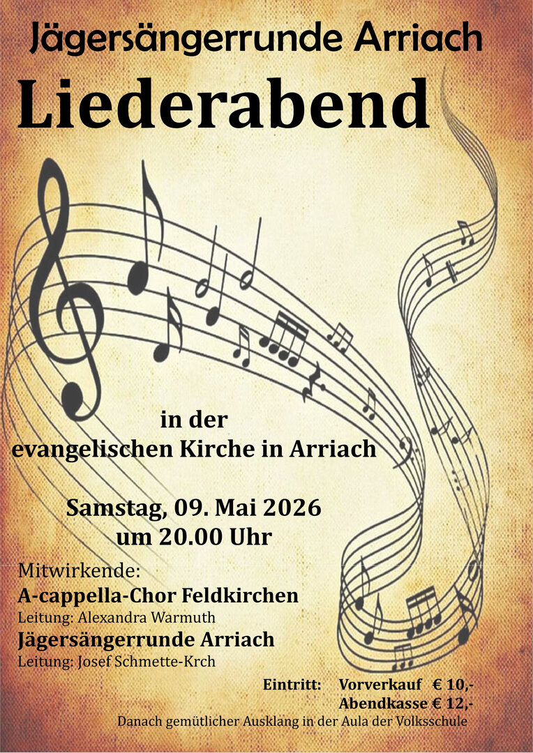 Die Jägersängerrunde Arriach lädt recht herzlich zum Liederabend am Samstag, dem 09. Mai 2026 um 20:00 Uhr ein!